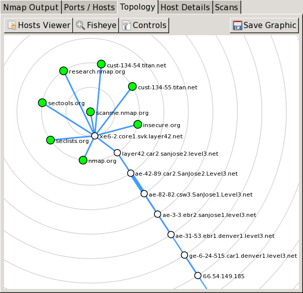 Each scan window contains five tabs which each display different aspects of the scan results. They are: “Nmap Output”, “Ports / Hosts”, “Topology”, “Host Details”, and “Scans”. Each of these are discussed in this section.